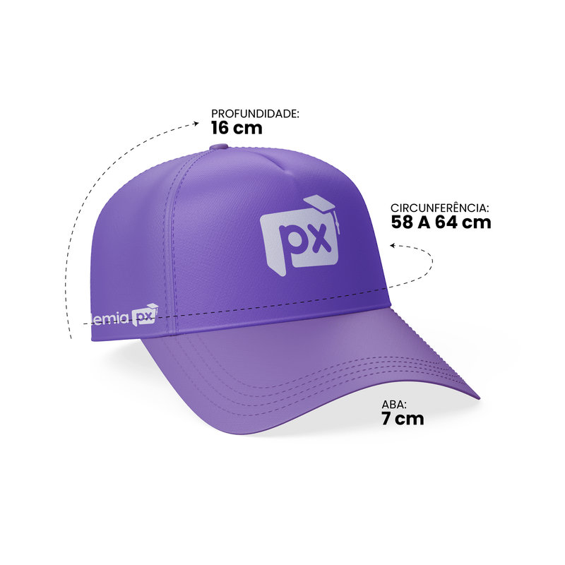 O boné é bem estruturado, com ajuste traseiro em velcro para maior conforto. Traz detalhes bordados que fazem a diferença: no ajuste uma pequena logo PX, na lateral a logo da Academia PX e na parte frontal a logo PX.